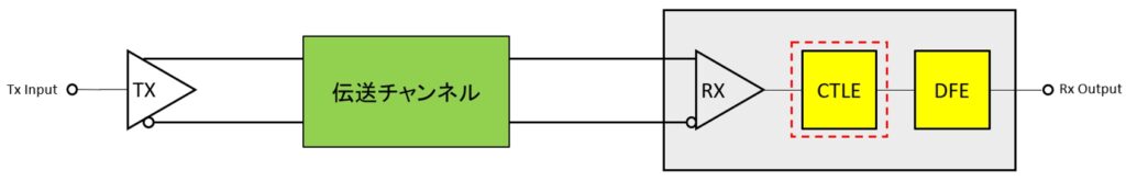 Continuous-Time Linear Equalizer (CTLE)は、連続時間線形イコライザとも呼ばれており、伝送チャンネルにより減衰した高周波成分を補償し、逆に相対的に大きくなってしまった低周波成分を抑圧する機能を持つアナログ方式のイコライザです。 一般的に、受信デバイス側に実装され、Decision Feedback Equalizer (DFE) の前段に置かれます。