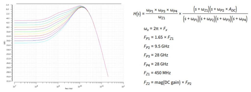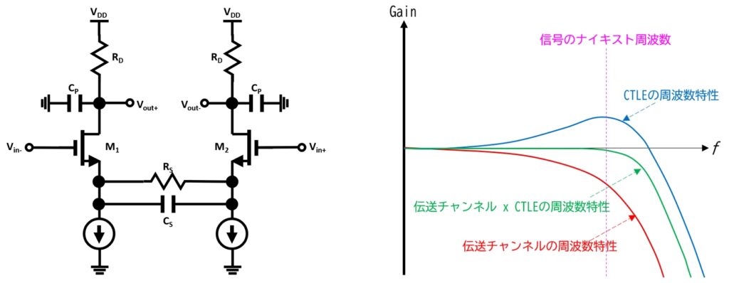 図16左は、SerDesや高速デジタルI/Oレシーバの一般的な2ポール1ゼロアクティブCTLEの実装例です。 RS,CSが低域のポールを形成、RD,CPがゼロを形成しています。 (RD,CPは高域のポール形成にも寄与します。)