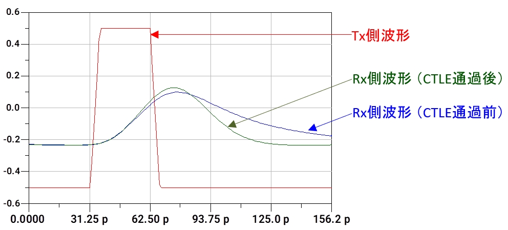 CTLE通過前の波形を見ると、立下り後に尾を引くような波形が観測されますが、CTLEにより、立上り/立下りのなまりの改善が見られます。 もともと、CTLEは誘電損失などによる伝送チャンネルの周波数減衰を補正するために導入されたものですが、この波形からシンボル間干渉の軽減にも繋がると考えられます。