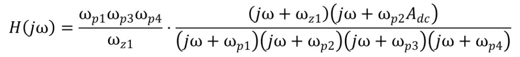 この式に対し、低周波領域(ωがゼロやポールに対して十分に低い周波数領域)、中周波領域(ナイキスト周波数:16GHz前後)、高周波領域(ωがゼロやポールに対して十分に高い周波数領域)の3つの領域に対するゲインを考えます。