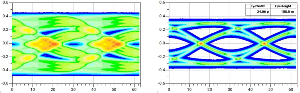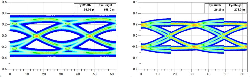 図20は、シミュレーションで得られた結果で、伝送チャンネルを通過後の、CTLE適用前後のアイ波形を比較しています。 左側がCTLE通過前、右側がCTLE通過後の波形であり、本ケースではPCIe Gen5の6dBプリセットを適用しています。 CTLE通過前はアイがほぼ完全に閉じていますが、通過後は高周波成分が補償され、明確にアイが開いていることが確認できます。