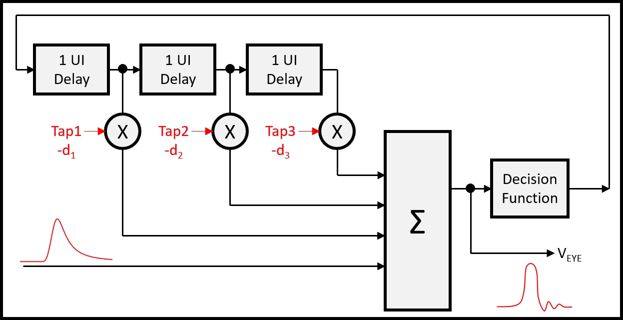 Decision Feedback Equalizer(DFE)は、判定帰還型イコライザとも呼ばれています。 Feed Forward Equalizer (FFE)と同様に、シンボル間干渉によって生じる波形の歪みを補正し、より正確な判定を行えるよう設けられる非線形イコライザの一種で、DFEは専ら受信側に設けられます。 システムが許容する伝送チャンネル特性などに応じて、シンボル間干渉が後続ビットへ及ぼす影響範囲が決まりますので、その影響を補償するために必要なタップ数が定められます。