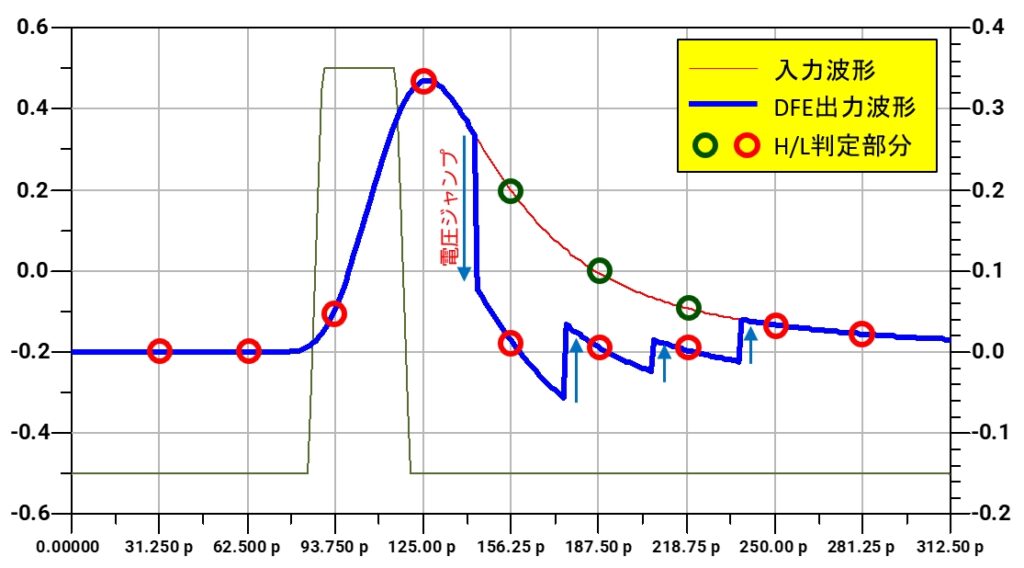 スライサによる判定結果がシフトレジスタへ転送されると、各タップ係数に応じたフィードバック補正が加えられます。 判定結果が離散値であるため、フィードバック量が段階的に変化することによる電圧ジャンプが生じます。 図のDFE出力波形からもこの電圧ジャンプの発生が確認できます。 3タップ構成の場合、シフトレジスタの出力値が、