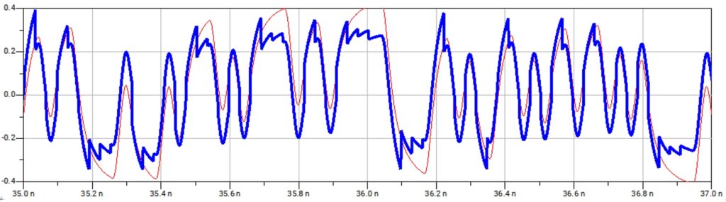 図26、図27にADSによるシミュレーション結果を示します。 図26はDFE通過前後のアイ波形で、左図がDFE通過前、右図がDFE通過後です。 同様に、図27はDFE通過前後のトランジェント波形で、細い赤色の波形がDFE通過前、太い青色の波形がDFE通過後です。 アイ波形を見るとDFEを適用することで、アイパターンが開口しているのが確認できます。 トランジェント波形を見るとノコギリ波状の形状が現れますが、これは前節で説明した通り、DFEの仕組みによって生じる電圧ジャンプが原因です。 このため、アイパターンには非線形な部分が見られますが、これは特に問題となるものではありません。