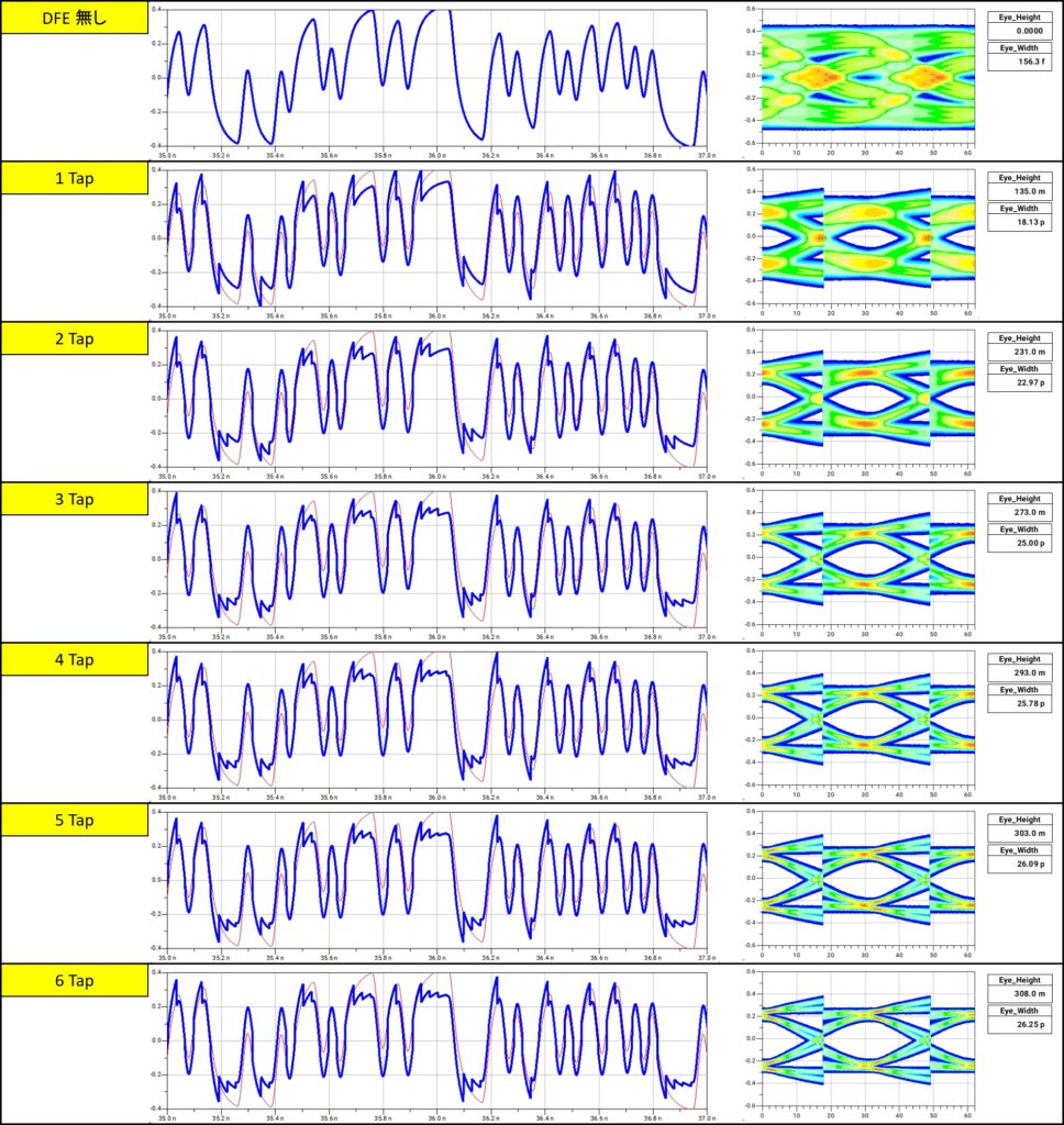 次にDFEのタップ数の違いがアイ開口に与える影響について検証してみようと思います。