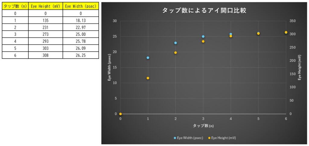 タップ数を増やすにつれてアイ開口は大きくなっているのが確認できます。